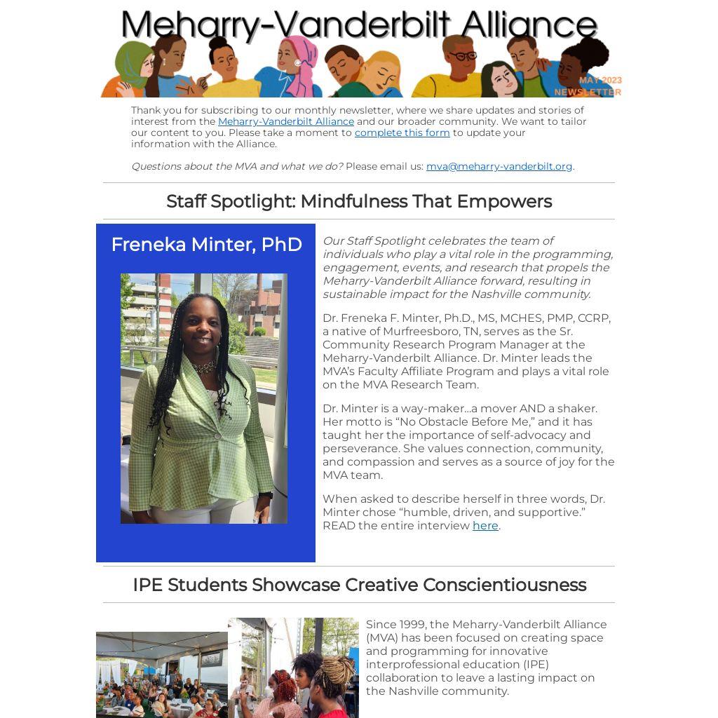 Our Staff Spotlight celebrates the team of individuals who play a vital role in the programming, engagement, events, and research that propels the Meharry-Vanderbilt Alliance forward, resulting in sustainable impact for the Nashville community.