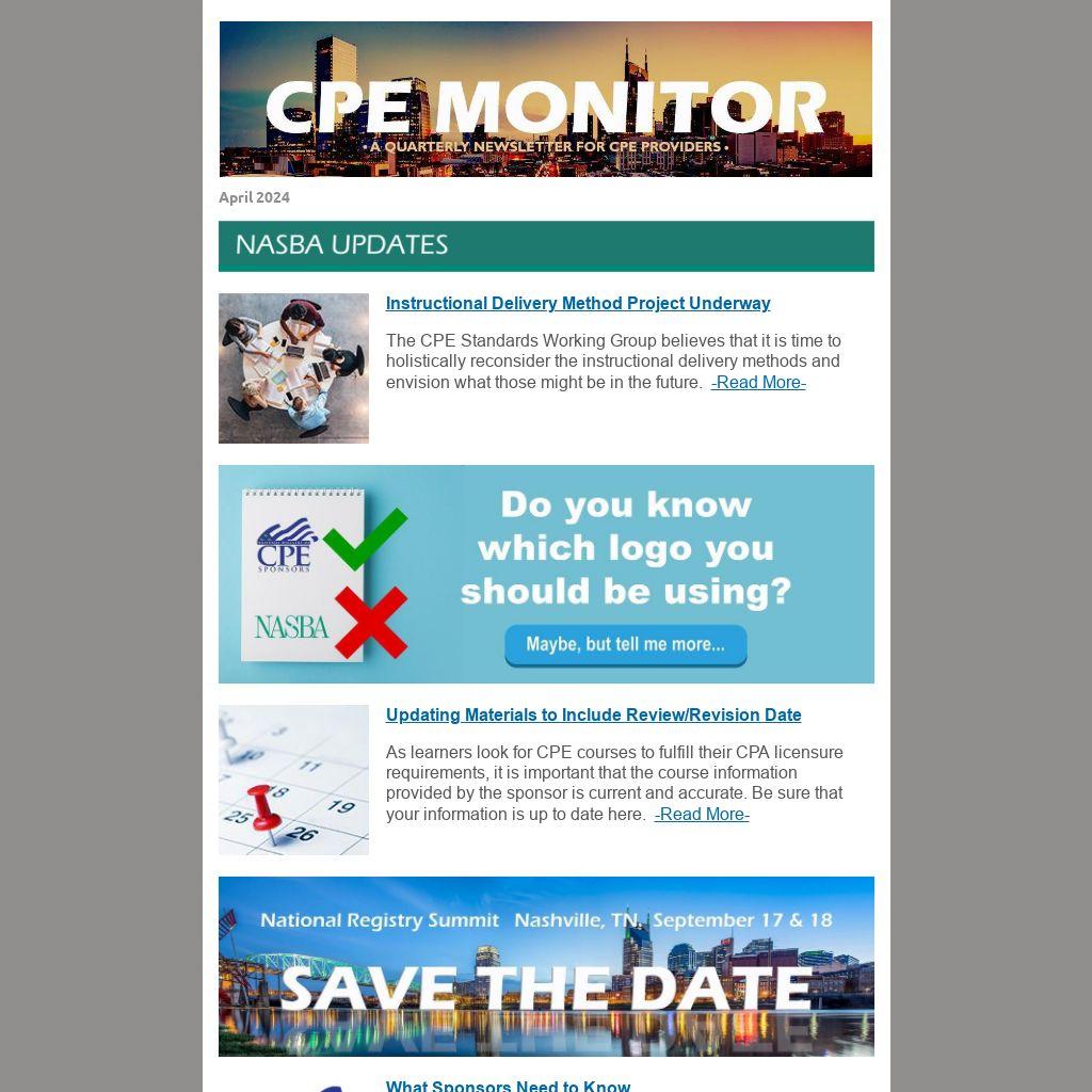 Click here to see the organizations that have been added to the National Registry of CPE Sponsors from January 1, 2024 through March 31, 2024.