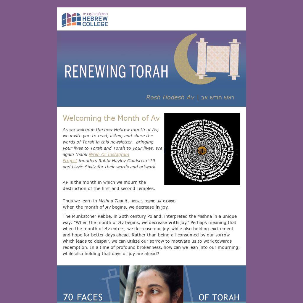 As we welcome the new Hebrew month of Av, we invite you to read, listen, and share the words of Torah in this newsletter—bringing your lives to Torah and Torah to your lives. We again thank Nireh Or Instagram Project founders Rabbi Hayley Goldstein`19 and Lizzie Sivitz for their words and artwork.