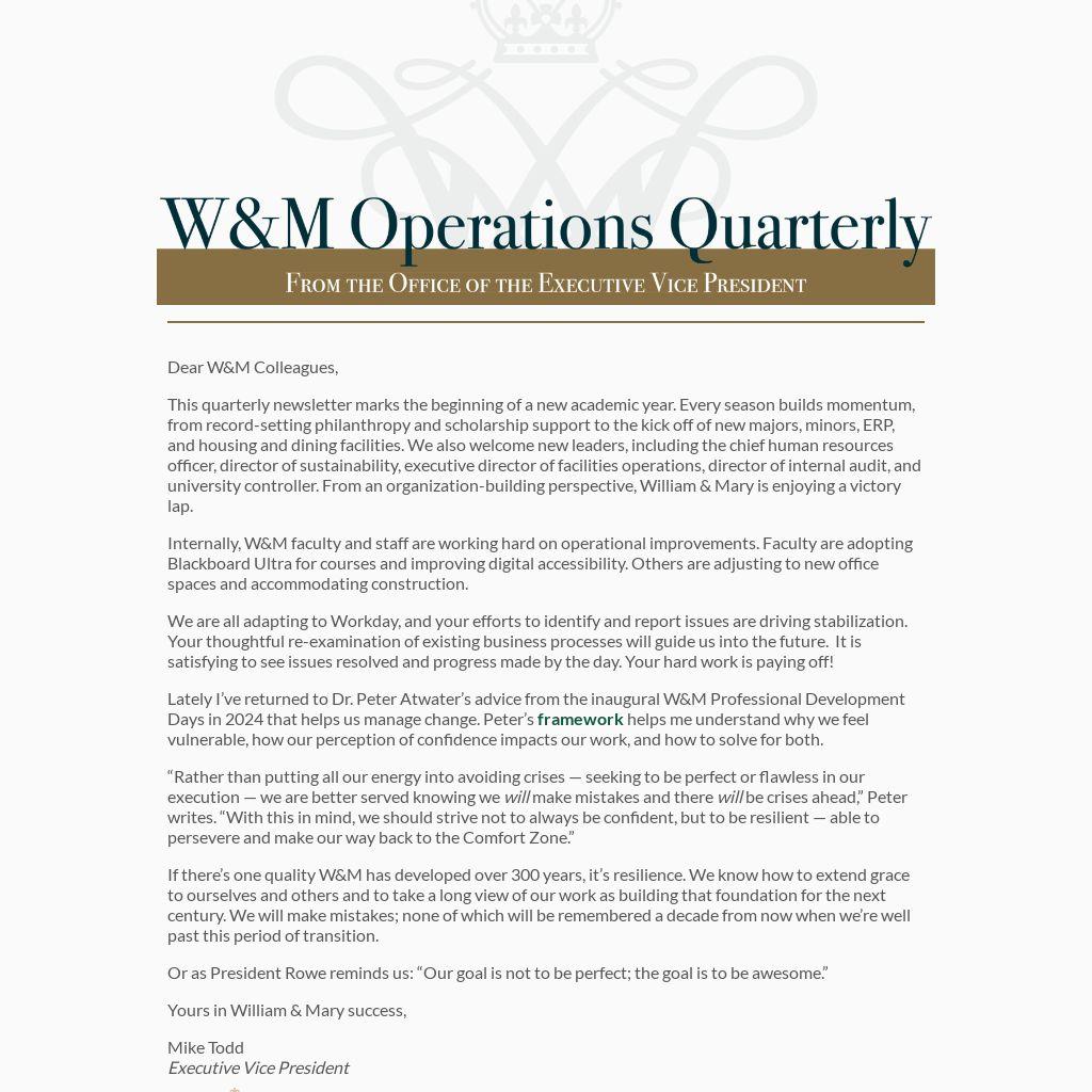 This quarterly newsletter marks the beginning of a new academic year. Every season builds momentum, from record-setting philanthropy and scholarship support to the kick off of new majors, minors, ERP, and housing and dining facilities. We also welcome new leaders, including the chief human resources officer, director of sustainability, executive director of facilities operations, director of internal audit, and university controller. From an organization-building perspective, William & Mary is enjoying a victory lap.