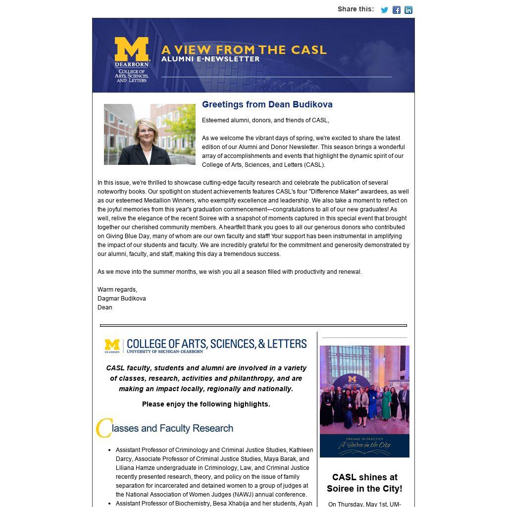As we welcome the vibrant days of spring, we're excited to share the latest edition of our Alumni and Donor Newsletter. This season brings a wonderful array of accomplishments and events that highlight the dynamic spirit of our College of Arts, Sciences, and Letters (CASL).