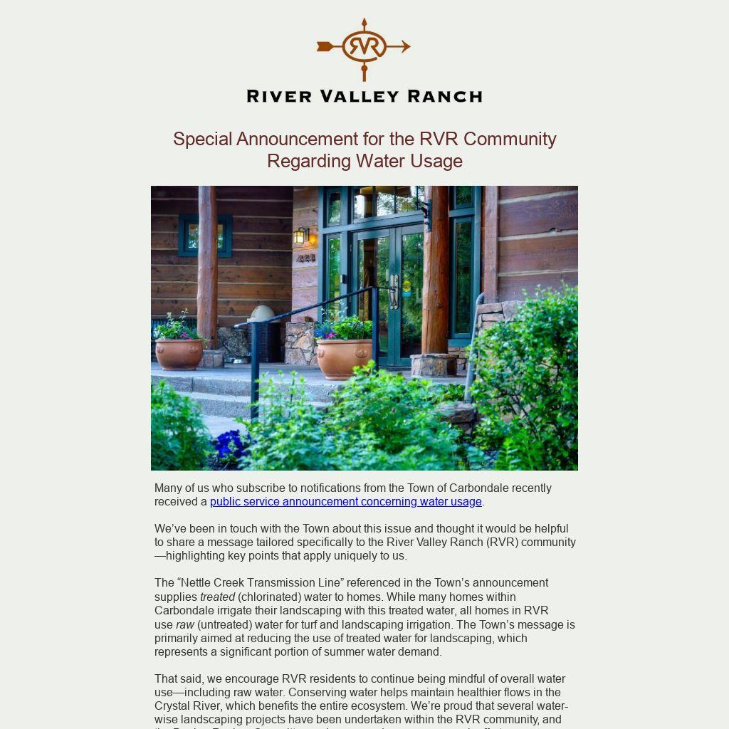 The “Nettle Creek Transmission Line” referenced in the Town’s announcement supplies treated (chlorinated) water to homes. While many homes within Carbondale irrigate their landscaping with this treated water, all homes in RVR use raw (untreated) water for turf and landscaping irrigation. The Town’s message is primarily aimed at reducing the use of treated water for landscaping, which represents a significant portion of summer water demand.