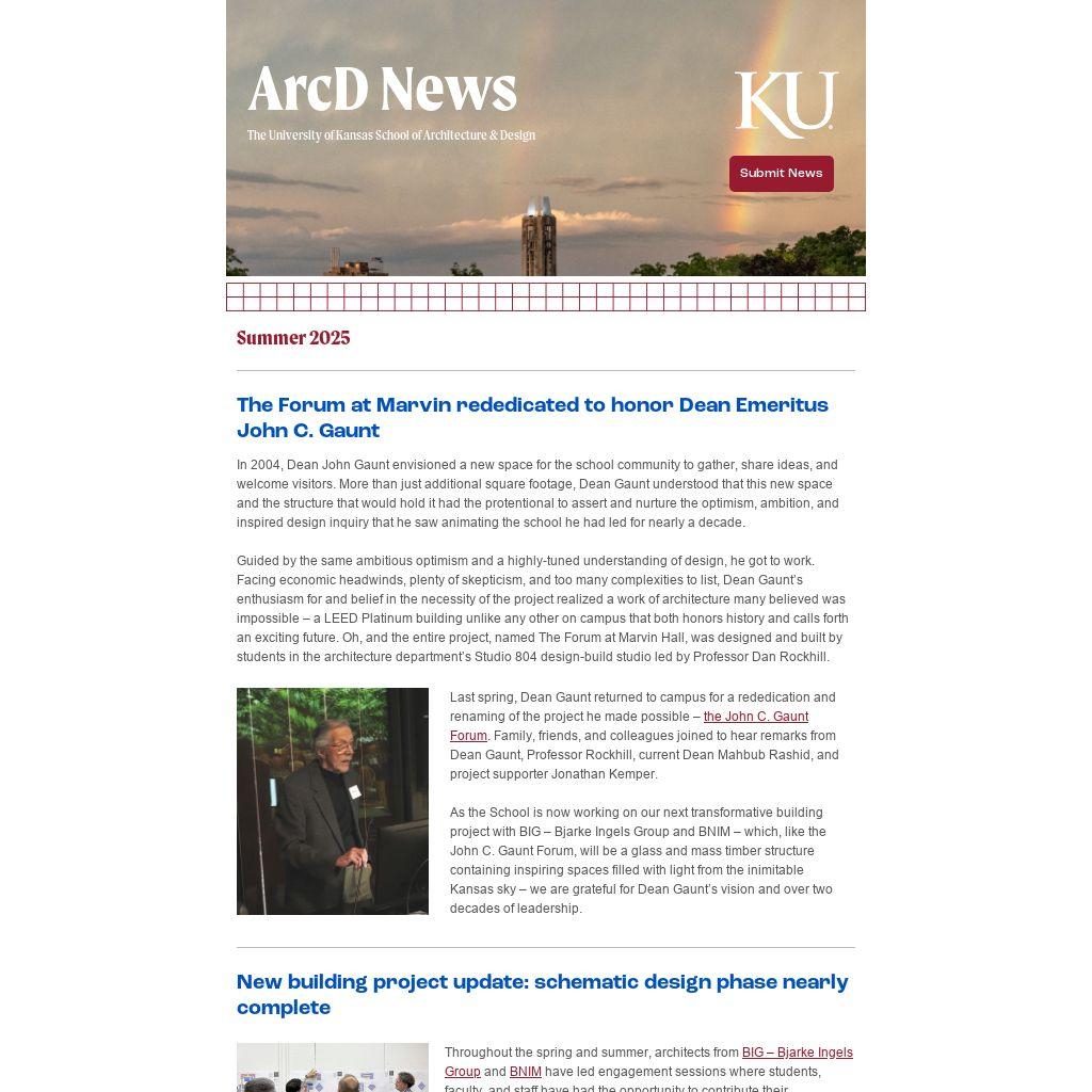 As the School is now working on our next transformative building project with BIG – Bjarke Ingels Group and BNIM – which, like the John C. Gaunt Forum, will be a glass and mass timber structure containing inspiring spaces filled with light from the inimitable Kansas sky – we are grateful for Dean Gaunt’s vision and over two decades of leadership.
