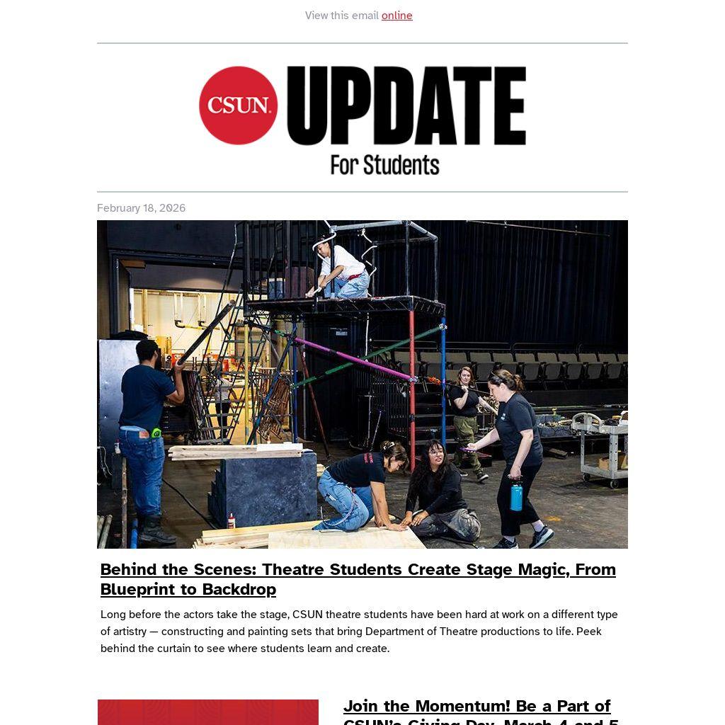 Long before the actors take the stage, CSUN theatre students have been hard at work on a different type of artistry — constructing and painting sets that bring Department of Theatre productions to life. Peek behind the curtain to see where students learn and create.