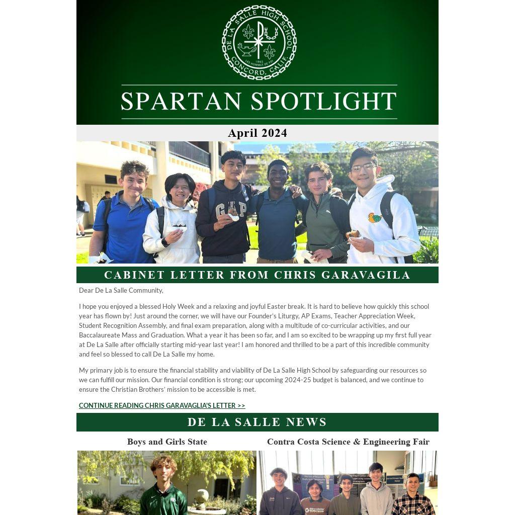 Congratulations to junior volleyball player Luke Nobrega, who was named our March Student-Athlete of the Month. It's hard to believe that the postseason is just around the corner for our spring sports. Visit the De La Salle Athletics Website for news, schedules, and scores as we close out another year of Spartan athletics.