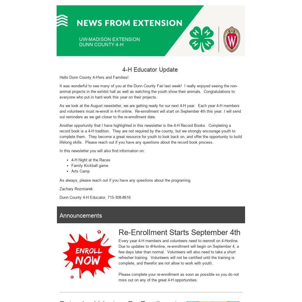 As we look at the August newsletter, we are getting ready for our next 4-H year. Each year 4-H members and volunteers must re-enroll in 4-H online. Re-enrollment will start on September 4th this year. I will send out reminders as we get closer to the re-enrollment date.