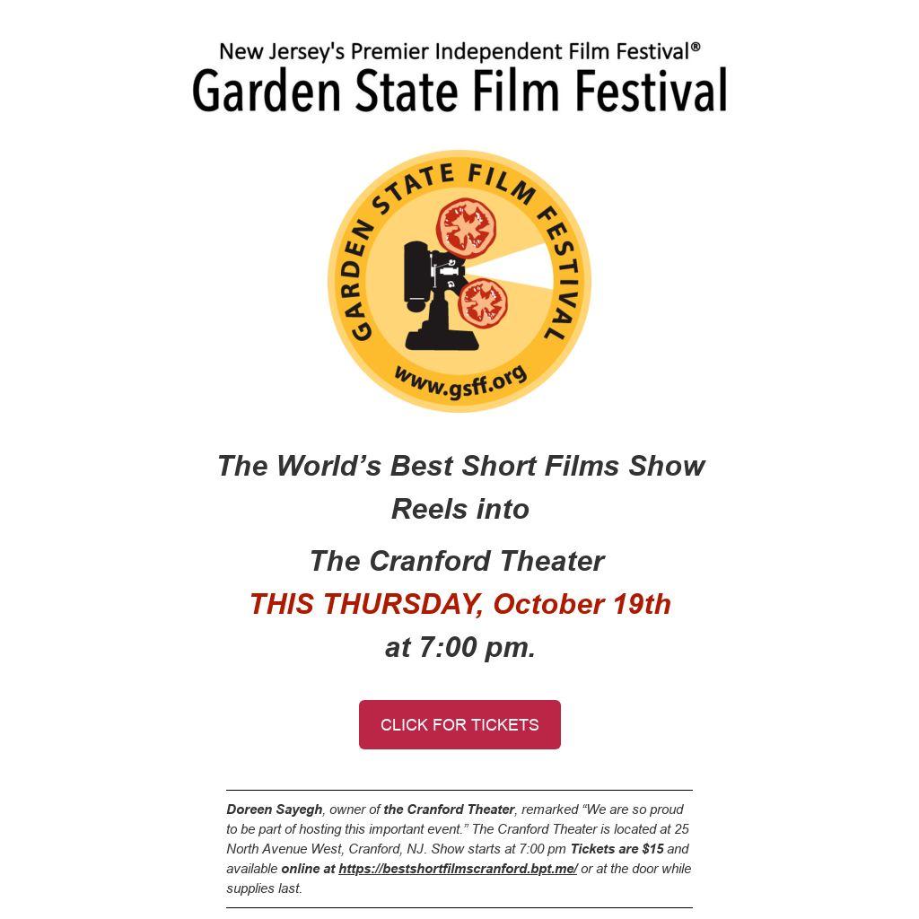 Doreen Sayegh, owner of the Cranford Theater, remarked “We are so proud to be part of hosting this important event.” The Cranford Theater is located at 25 North Avenue West, Cranford, NJ. Show starts at 7:00 pm Tickets are $15 and available online at https://bestshortfilmscranford.bpt.me/ or at the door while supplies last.