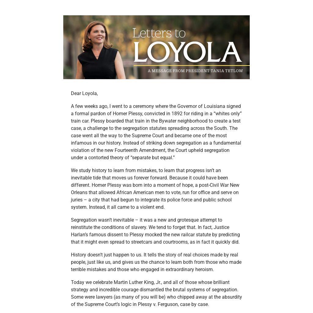 A few weeks ago, I went to a ceremony where the Governor of Louisiana signed a formal pardon of Homer Plessy, convicted in 1892 for riding in a “whites only” train car. Plessy boarded that train in the Bywater neighborhood to create a test case, a challenge to the segregation statutes spreading across the South. The case went all the way to the Supreme Court and became one of the most infamous in our history. Instead of striking down segregation as a fundamental violation of the new Fourteenth Amendment, the Court upheld segregation under a contorted theory of “separate but equal.”