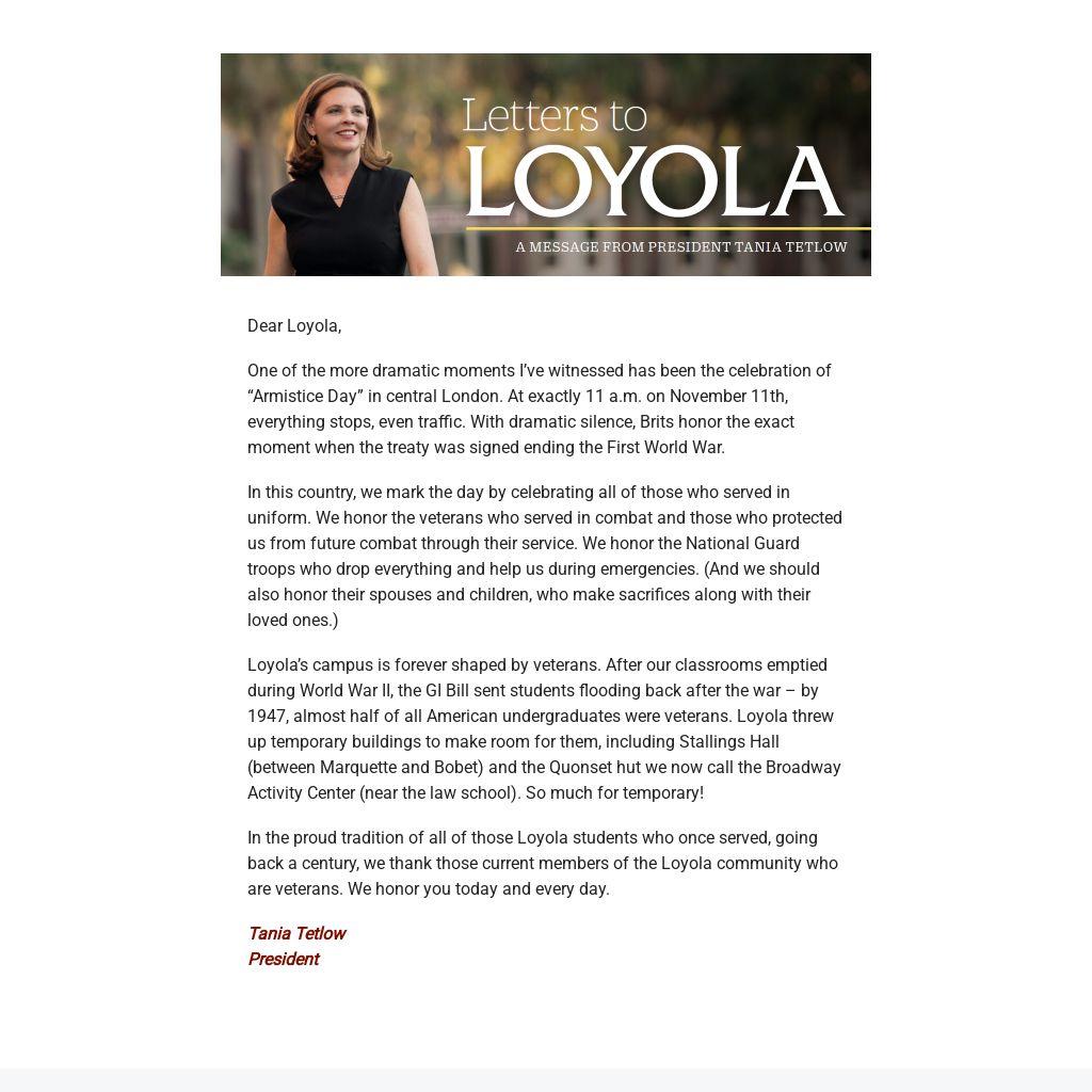 In the proud tradition of all of those Loyola students who once served, going back a century, we thank those current members of the Loyola community who are veterans. We honor you today and every day.