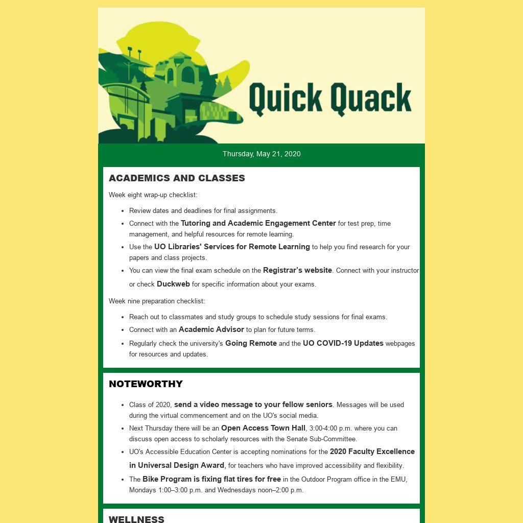 You can view the final exam schedule on the Registrar’s website. Connect with your instructor or check Duckweb for specific information about your exams.