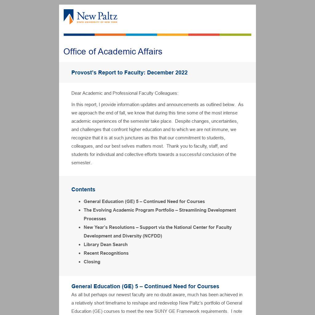 In sum, while substantial progress has been made, we do still need additional GE 5 offerings. Much appreciation goes to those departments and programs that have actively contributed already and to those with plans to do so. For any information you may need in moving forward, please see the General Education website at https://www.newpaltz.edu/ge/. You may address any questions directly to the GE Implementation Task Force at GEimplementation@newpaltz.edu.