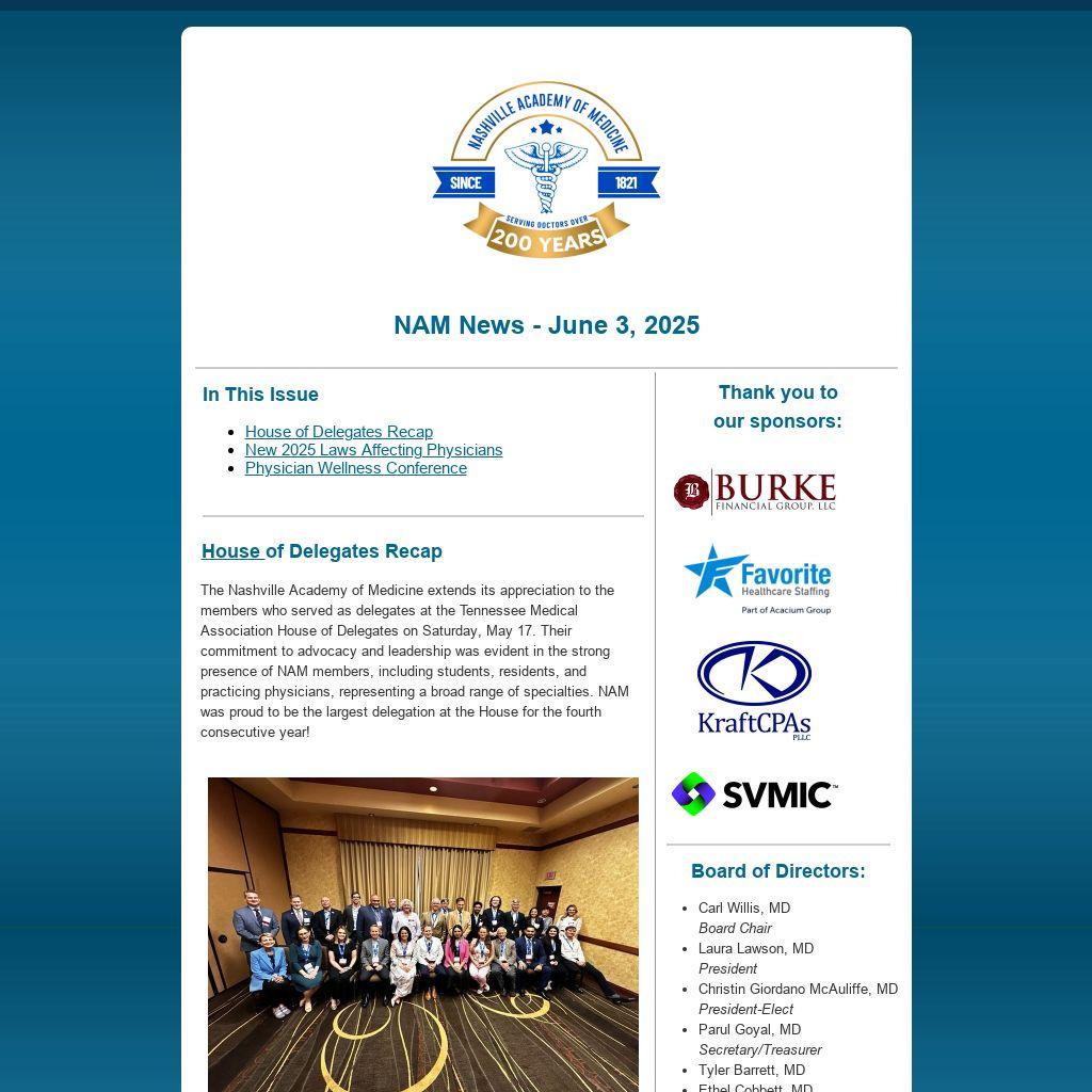 The Nashville Academy of Medicine extends its appreciation to the members who served as delegates at the Tennessee Medical Association House of Delegates on Saturday, May 17. Their commitment to advocacy and leadership was evident in the strong presence of NAM members, including students, residents, and practicing physicians, representing a broad range of specialties. NAM was proud to be the largest delegation at the House for the fourth consecutive year!