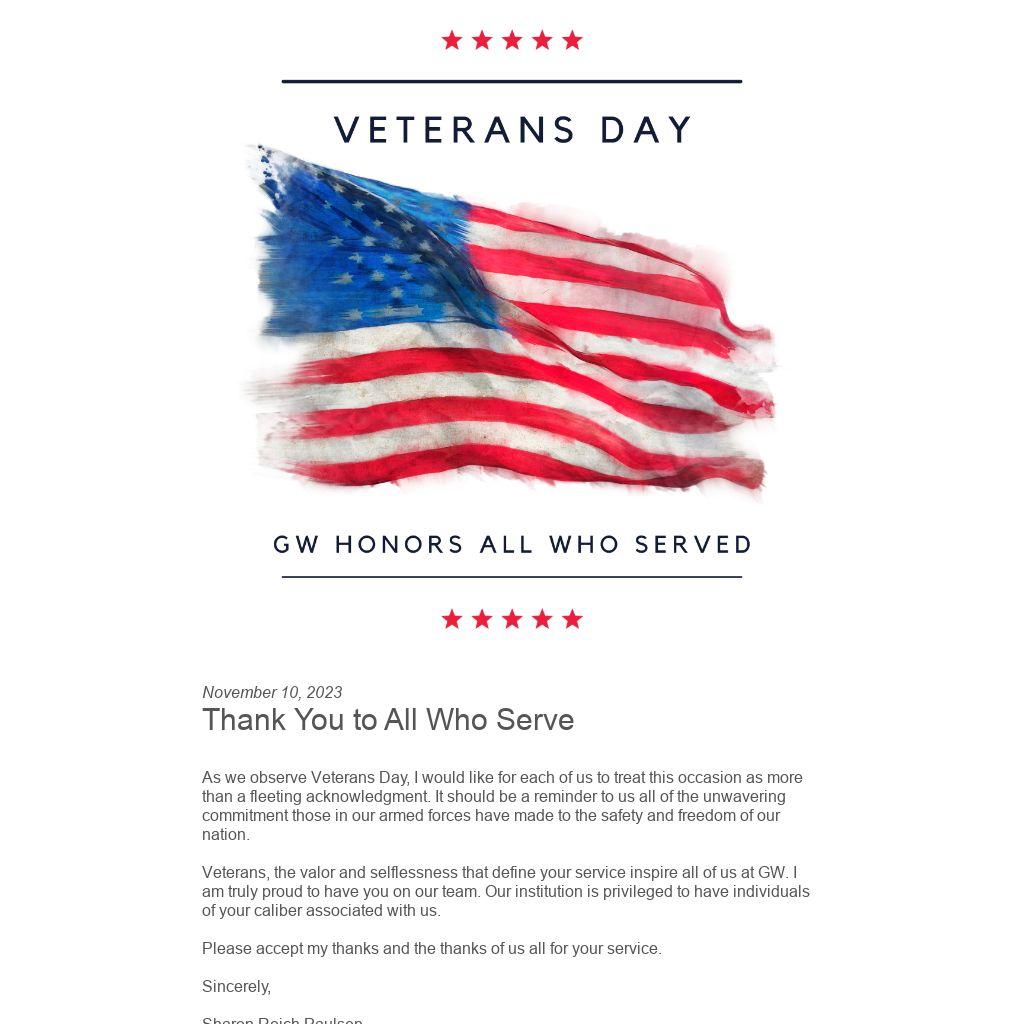 Veterans, the valor and selflessness that define your service inspire all of us at GW. I am truly proud to have you on our team. Our institution is privileged to have individuals of your caliber associated with us.