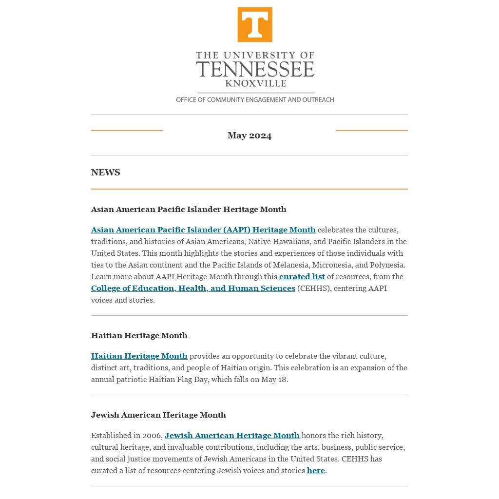 Participants will be provided with background literature, engage in facilitated discussion, and increase their knowledge as they reflect on their practice of community engagement, outreach, and scholarship. The in-person session will be held on June 6 from 9:00 a.m. to 3:00 p.m. If you would like to attend, please register here by June 3. For questions or more information, please email communityengagement@utk.edu.
