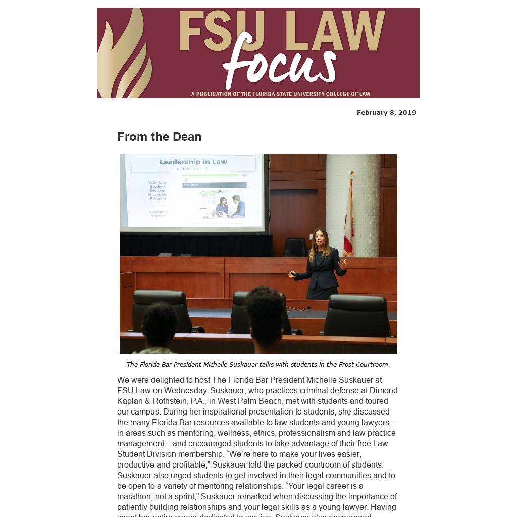 We were delighted to host The Florida Bar President Michelle Suskauer at FSU Law on Wednesday. Suskauer, who practices criminal defense at Dimond Kaplan & Rothstein, P.A., in West Palm Beach, met with students and toured our campus. During her inspirational presentation to students, she discussed the many Florida Bar resources available to law students and young lawyers – in areas such as mentoring, wellness, ethics, professionalism and law practice management – and encouraged students to take advantage of their free Law Student Division membership. “We’re here to make your lives easier, productive and profitable,” Suskauer told the packed courtroom of students. Suskauer also urged students to get involved in their legal communities and to be open to a variety of mentoring relationships. “Your legal career is a marathon, not a sprint,” Suskauer remarked when discussing the importance of patiently building relationships and your legal skills as a young lawyer. Having spent her entire career dedicated to service, Suskauer also encouraged students to fulfill their obligation to give back. I hope you will join me in thanking Suskauer for connecting with and providing sage advice to our students!