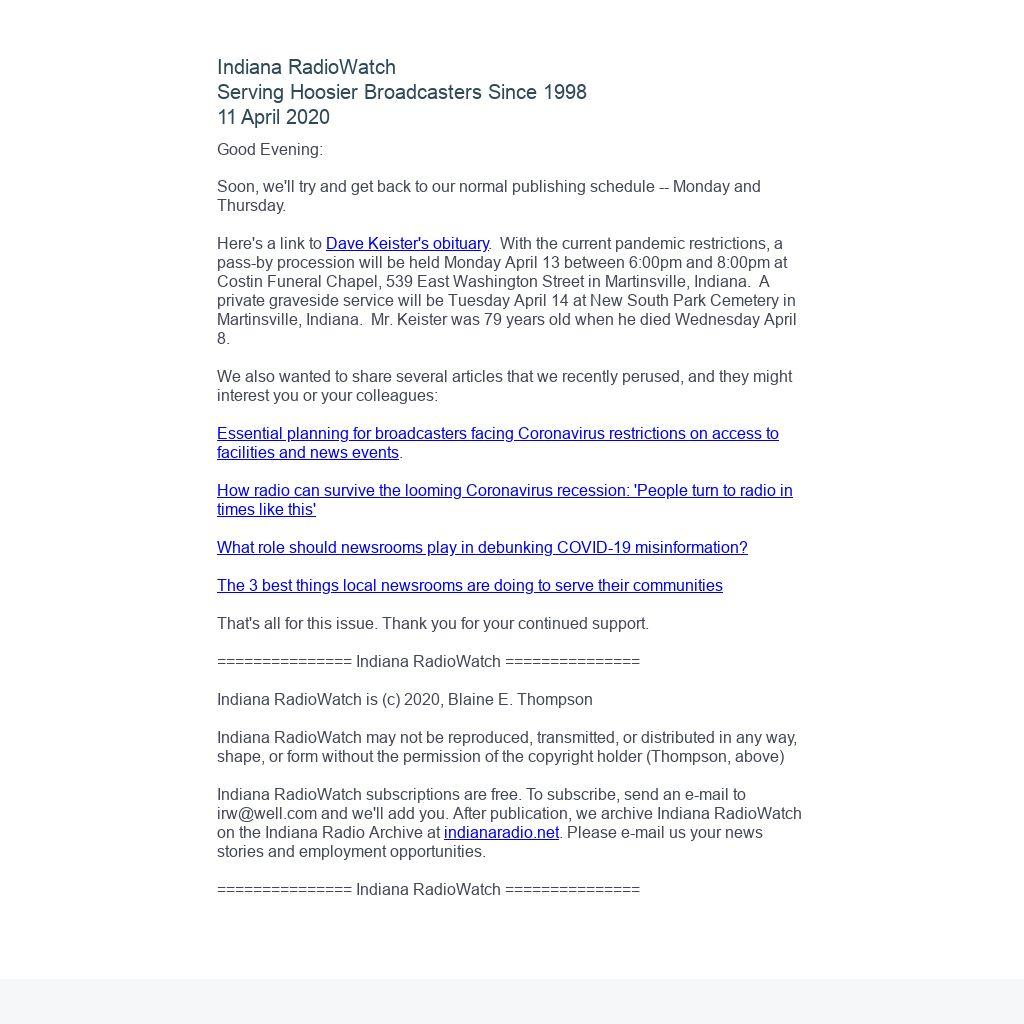 Indiana RadioWatch subscriptions are free. To subscribe, send an e-mail to irw@well.com and we'll add you. After publication, we archive Indiana RadioWatch on the Indiana Radio Archive at indianaradio.net. Please e-mail us your news stories and employment opportunities.
