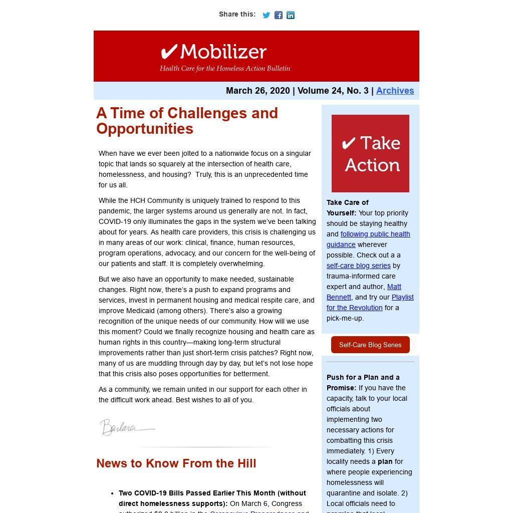 - NHCHC issue brief summarizing the impact on the homeless population and immediate policy actions needed at the local level: COVID-19 & the HCH Community: Needed Policy Responses for a High-Risk Group