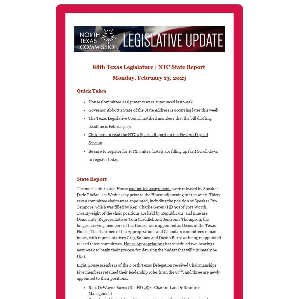 Join us on March 23, 2023, as we travel to Austin for North Texas Unites. This full-day event will feature a variety of meetings with members of the North Texas delegation and end with an evening reception at the Capitol. The NTC team has noted several large-scale events are taking place in Austin during the week of North Texas Unites, so we encourage you to purchase your ticket and book your hotel as soon as possible!