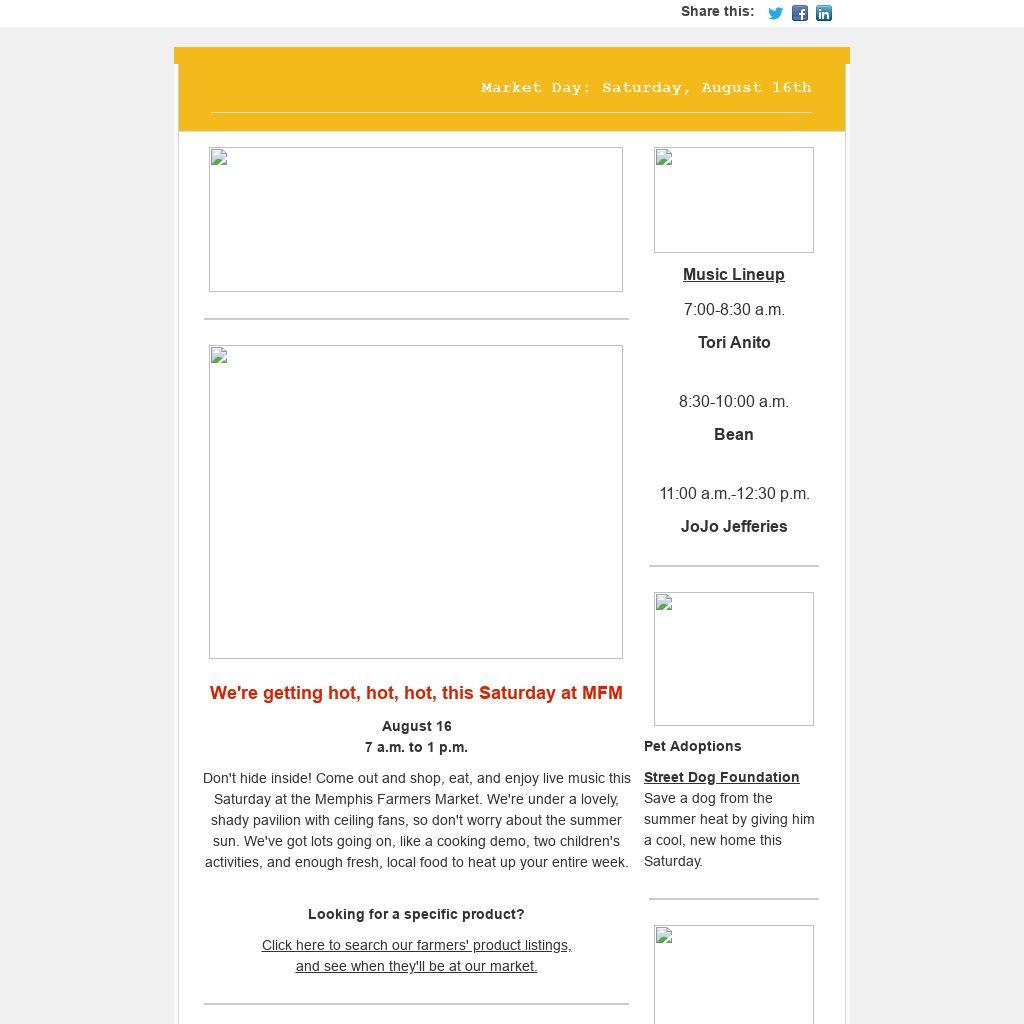 Don't hide inside! Come out and shop, eat, and enjoy live music this Saturday at the Memphis Farmers Market. We're under a lovely, shady pavilion with ceiling fans, so don't worry about the summer sun. We've got lots going on, like a cooking demo, two children's activities, and enough fresh, local food to heat up your entire week.
