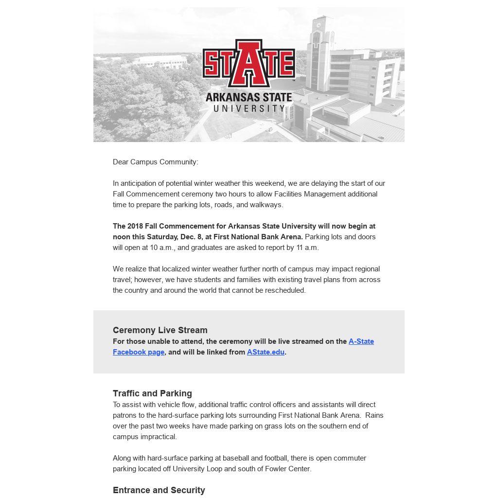 The 2018 Fall Commencement for Arkansas State University will now begin at noon this Saturday, Dec. 8, at First National Bank Arena. Parking lots and doors will open at 10 a.m., and graduates are asked to report by 11 a.m.