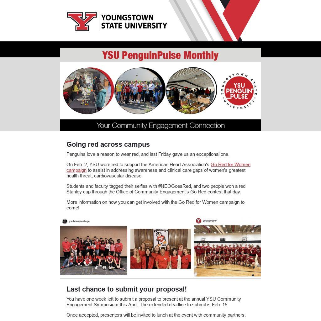 The YSU Office of Community Engagement is dedicated to creating a community-engaged campus driven by the value from mutually beneficial campus community partnerships. This monthly newsletter is your community engagement connection.