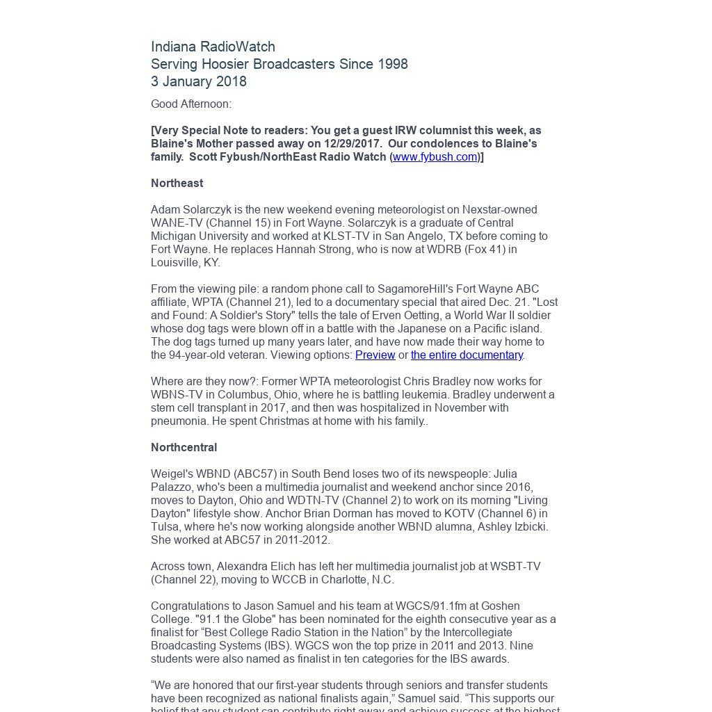 IndianaRadioWatch subscriptions are free. To subscribe, send an e-mail to irw@well.com and we'll add you. After publication, we archive Indiana RadioWatch on the Indiana Radio Archive at http://www.indianaradio.net. Please e-mail us your news stories and employment opportunities.
