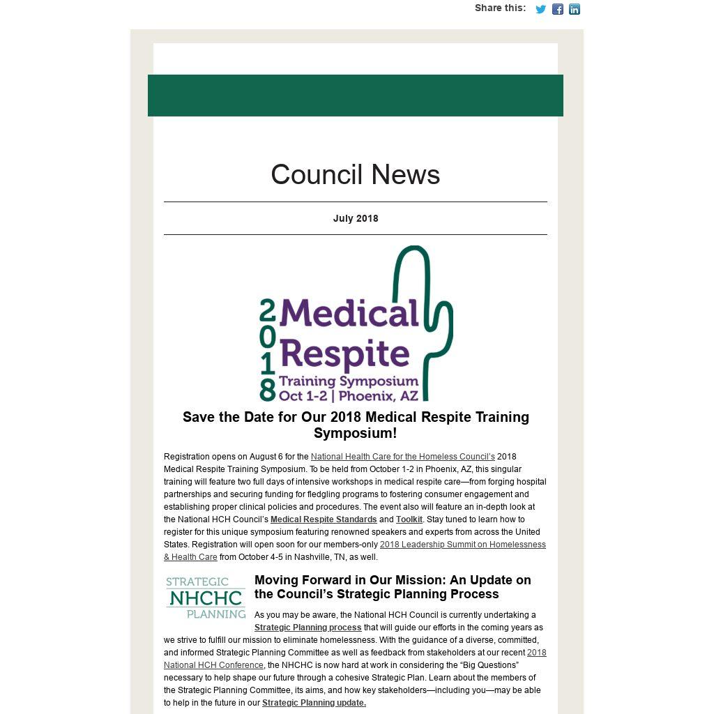 Registration opens on August 6 for the National Health Care for the Homeless Council’s 2018 Medical Respite Training Symposium. To be held from October 1-2 in Phoenix, AZ, this singular training will feature two full days of intensive workshops in medical respite care—from forging hospital partnerships and securing funding for fledgling programs to fostering consumer engagement and establishing proper clinical policies and procedures. The event also will feature an in-depth look at the National HCH Council’s Medical Respite Standards and Toolkit. Stay tuned to learn how to register for this unique symposium featuring renowned speakers and experts from across the United States. Registration will open soon for our members-only 2018 Leadership Summit on Homelessness & Health Care from October 4-5 in Nashville, TN, as well.