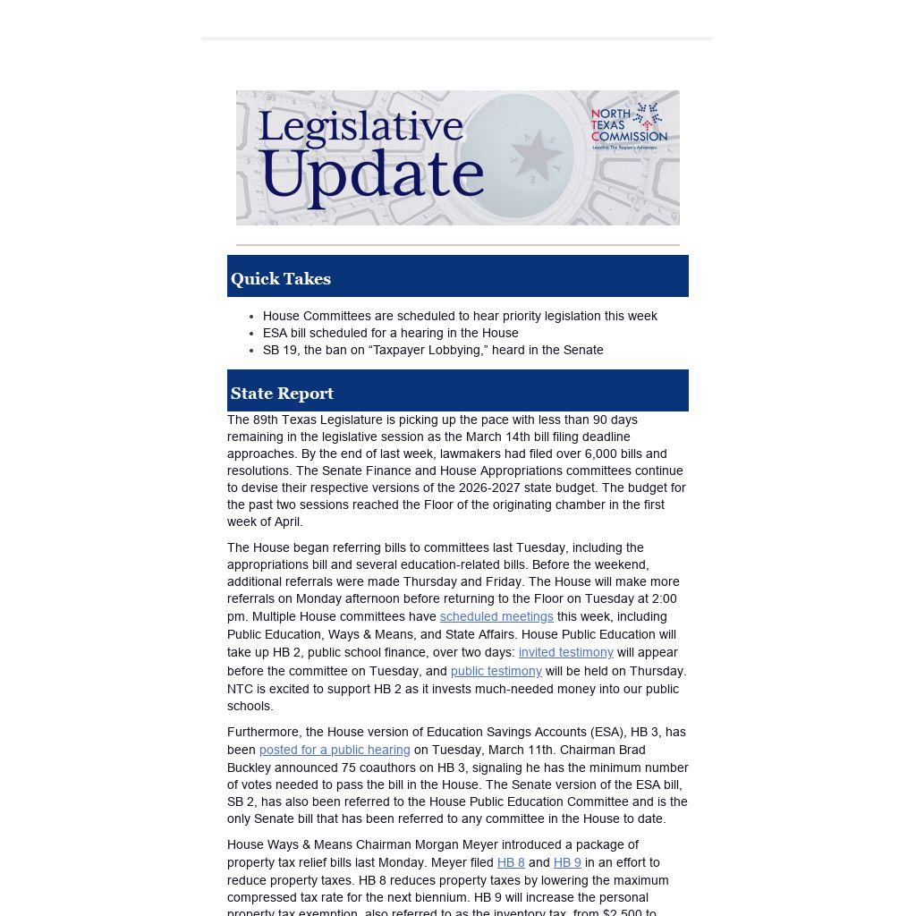 The House began referring bills to committees last Tuesday, including the appropriations bill and several education-related bills. Before the weekend, additional referrals were made Thursday and Friday. The House will make more referrals on Monday afternoon before returning to the Floor on Tuesday at 2:00 pm. Multiple House committees have scheduled meetings this week, including Public Education, Ways & Means, and State Affairs. House Public Education will take up HB 2, public school finance, over two days: invited testimony will appear before the committee on Tuesday, and public testimony will be held on Thursday. NTC is excited to support HB 2 as it invests much-needed money into our public schools.