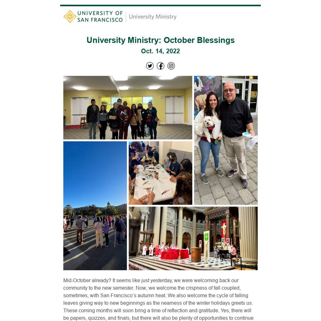 Mid-October already? It seems like just yesterday, we were welcoming back our community to the new semester. Now, we welcome the crispness of fall coupled, sometimes, with San Francisco’s autumn heat. We also welcome the cycle of falling leaves giving way to new beginnings as the nearness of the winter holidays greets us. These coming months will soon bring a time of reflection and gratitude. Yes, there will be papers, quizzes, and finals, but there will also be plenty of opportunities to continue pursuing self-growth, self-care, and connection.