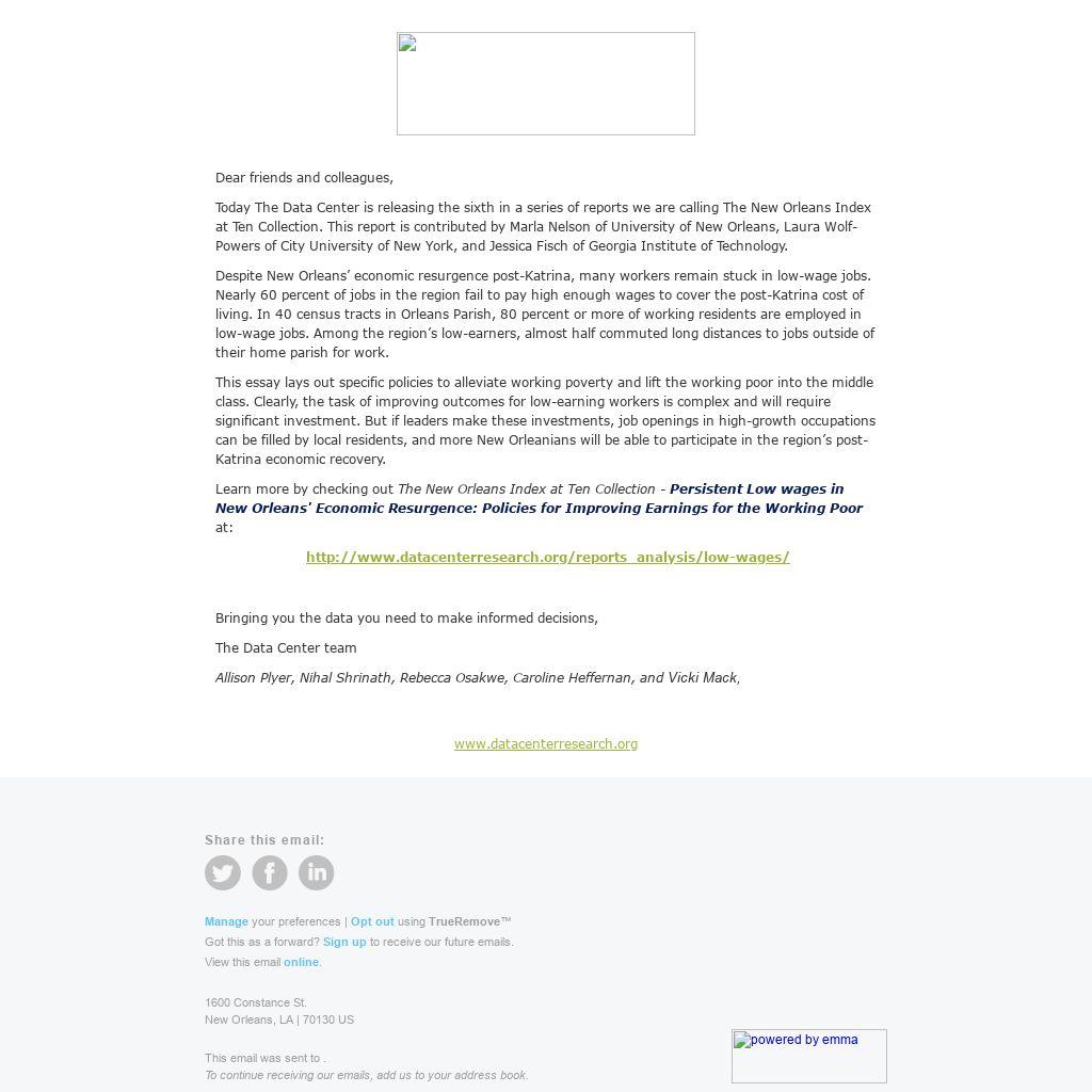 Learn more by checking out The New Orleans Index at Ten Collection - Persistent Low wages in New Orleans' Economic Resurgence: Policies for Improving Earnings for the Working Poor at: