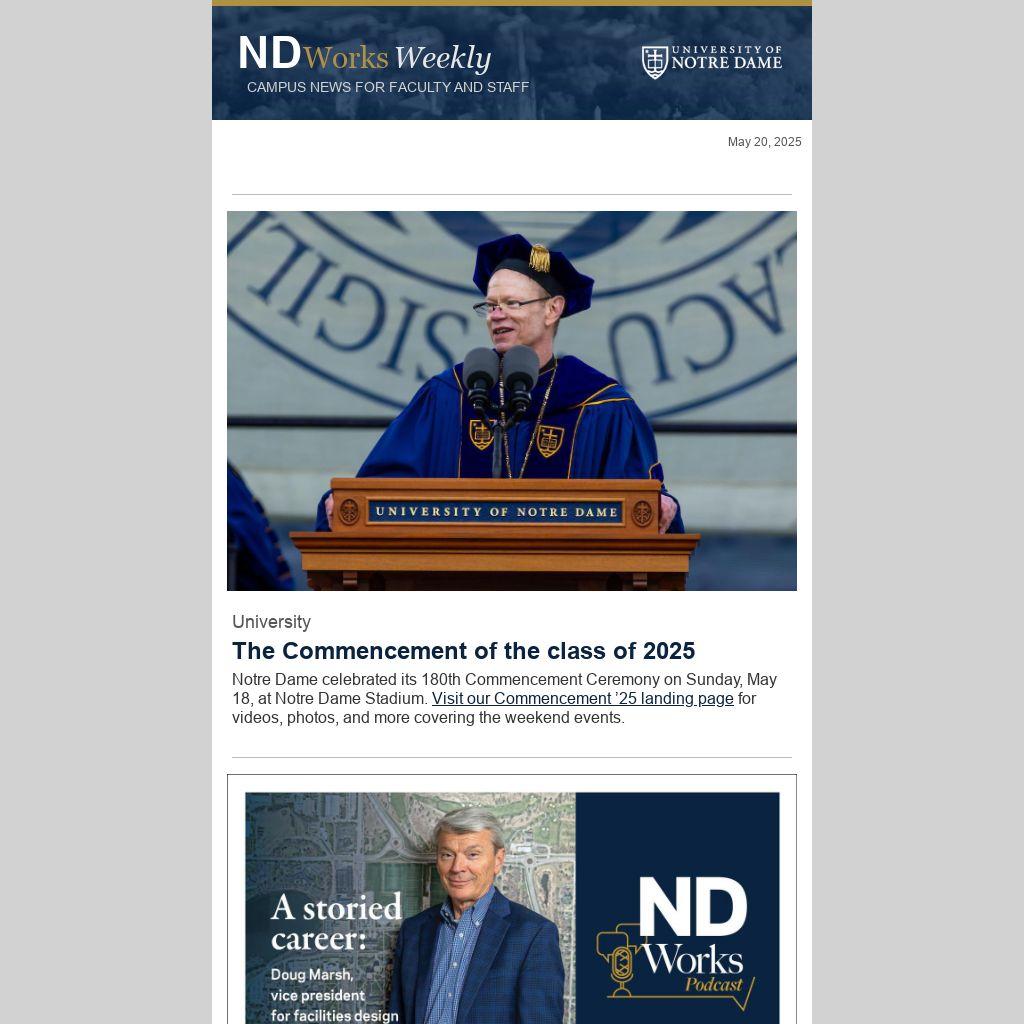In this episode of NDWorks Podcast, host Natalie Davis Miller sits down with Doug Marsh, vice president for facilities design and operations and University architect, to take a look back at his storied career, as well as his plans for retirement.