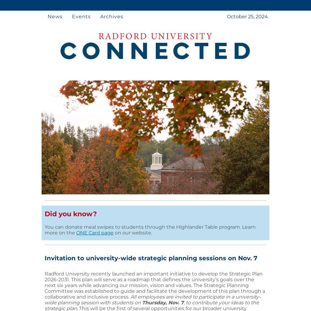 Radford University recently launched an important initiative to develop the Strategic Plan 2026-2031. This plan will serve as a roadmap that defines the university’s goals over the next six years while advancing our mission, vision and values. The Strategic Planning Committee was established to guide and facilitate the development of this plan through a collaborative and inclusive process. All employees are invited to participate in a university-wide planning session with students on Thursday, Nov. 7, to contribute your ideas to the strategic plan. This will be the first of several opportunities for our broader university community to participate in the strategic planning process.