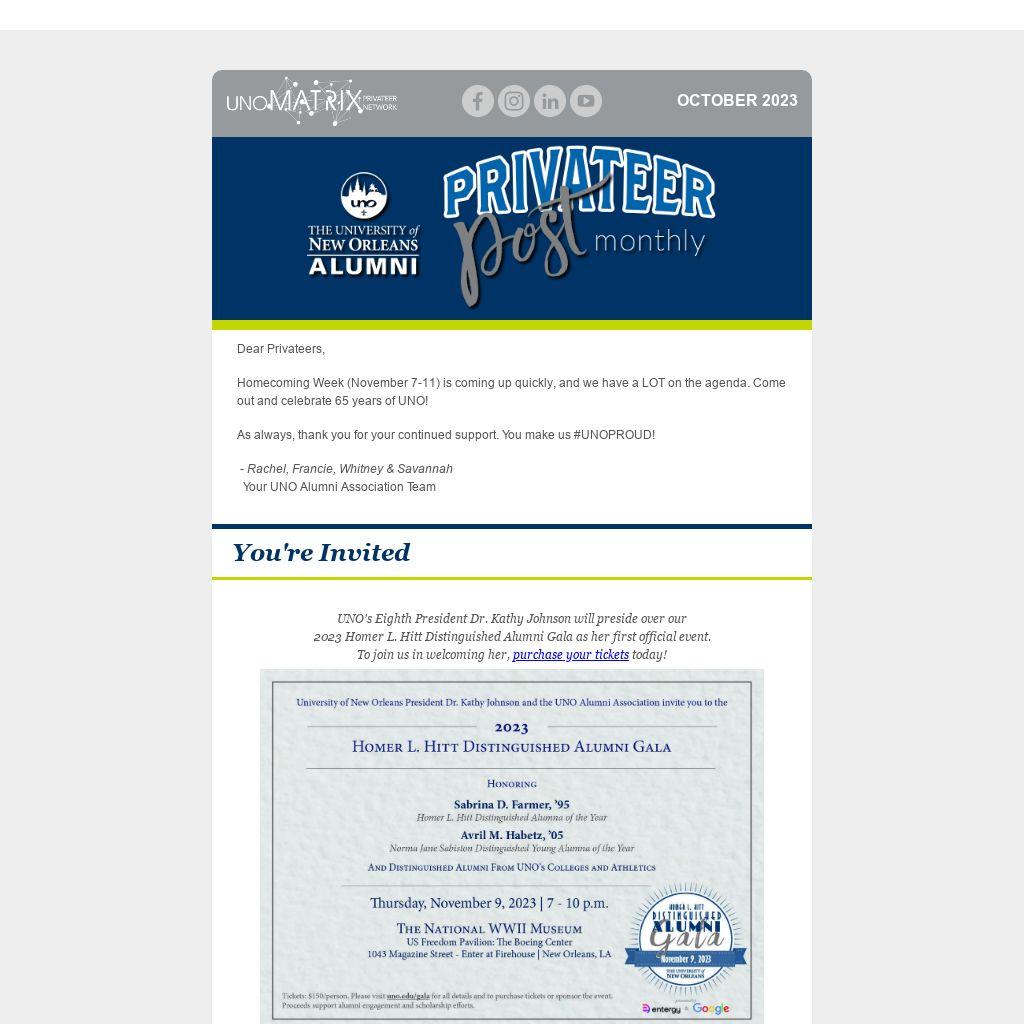 uno.edu/alumni | 504.280.2586 | alumni@uno.edu