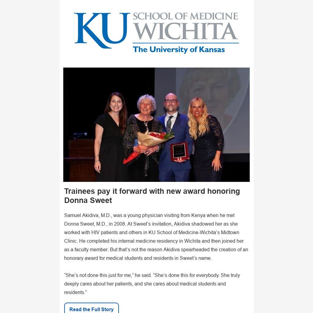 Samuel Akidiva, M.D., was a young physician visiting from Kenya when he met Donna Sweet, M.D., in 2008. At Sweet’s invitation, Akidiva shadowed her as she worked with HIV patients and others in KU School of Medicine-Wichita’s Midtown Clinic. He completed his internal medicine residency in Wichita and then joined her as a faculty member. But that’s not the reason Akidiva spearheaded the creation of an honorary award for medical students and residents in Sweet’s name.