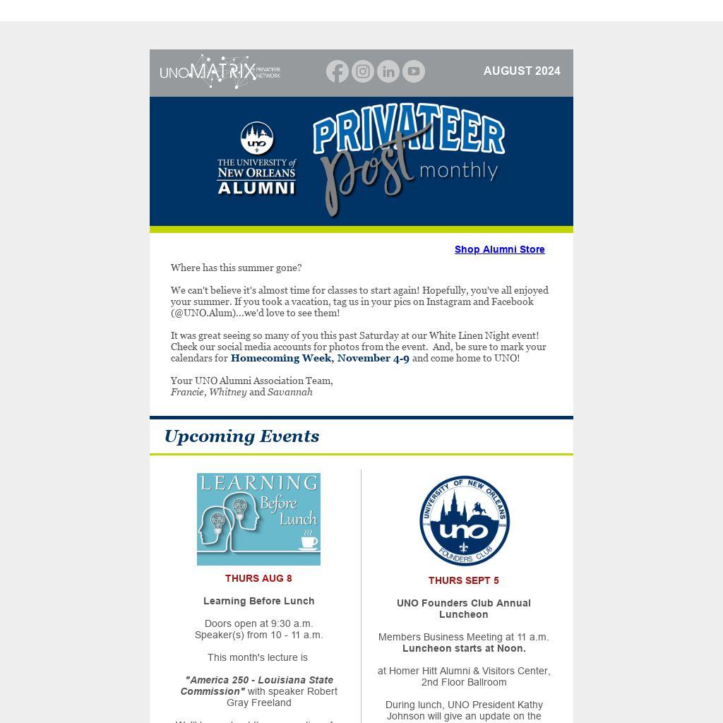 During lunch, UNO President Kathy Johnson will give an update on the state of the University. Alumni Peggy Scott & Errol Laborde will also speak about their memories from UNO.
