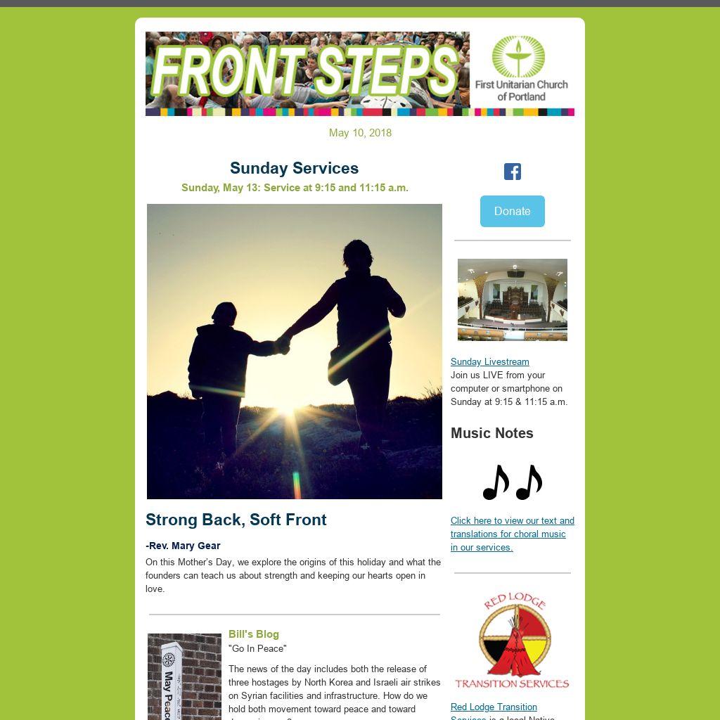 Do You Have an Item for E-news or the Sunday Bulletin?If you have an item you’d like published in our weekly Front Steps (eNews) or the Sunday Bulletin, please submit it to: