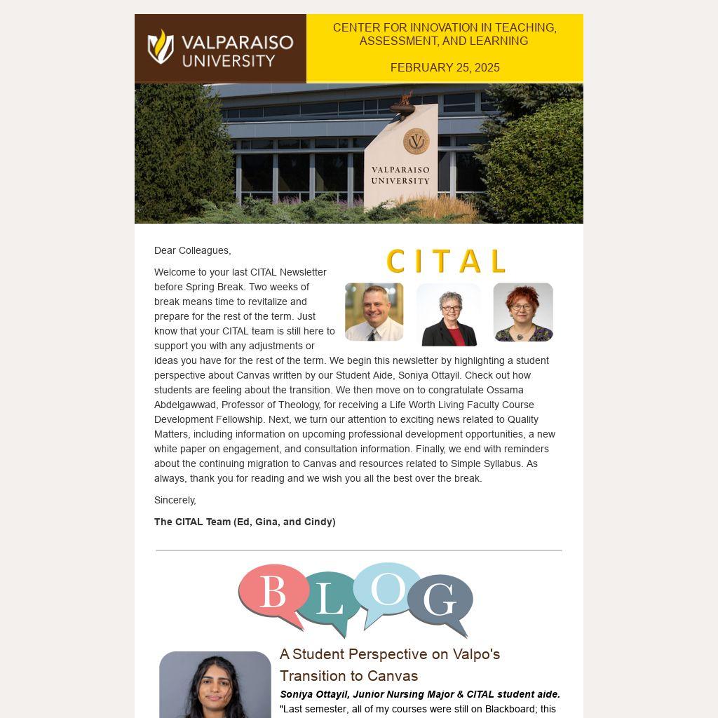Welcome to your last CITAL Newsletter before Spring Break. Two weeks of break means time to revitalize and prepare for the rest of the term. Just know that your CITAL team is still here to support you with any adjustments or ideas you have for the rest of the term. We begin this newsletter by highlighting a student perspective about Canvas written by our Student Aide, Soniya Ottayil. Check out how students are feeling about the transition. We then move on to congratulate Ossama Abdelgawwad, Professor of Theology, for receiving a Life Worth Living Faculty Course Development Fellowship. Next, we turn our attention to exciting news related to Quality Matters, including information on upcoming professional development opportunities, a new white paper on engagement, and consultation information. Finally, we end with reminders about the continuing migration to Canvas and resources related to Simple Syllabus. As always, thank you for reading and we wish you all the best over the break.