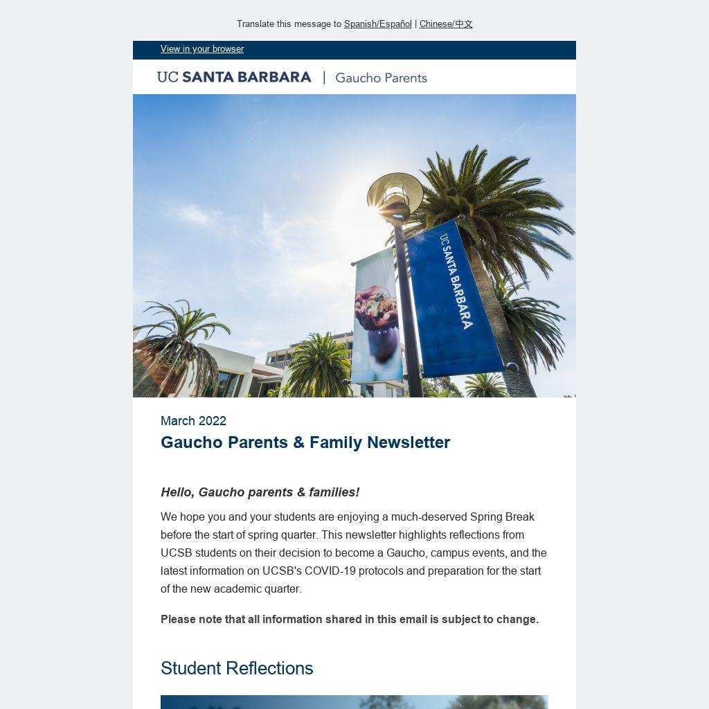 We hope you and your students are enjoying a much-deserved Spring Break before the start of spring quarter. This newsletter highlights reflections from UCSB students on their decision to become a Gaucho, campus events, and the latest information on UCSB's COVID-19 protocols and preparation for the start of the new academic quarter.