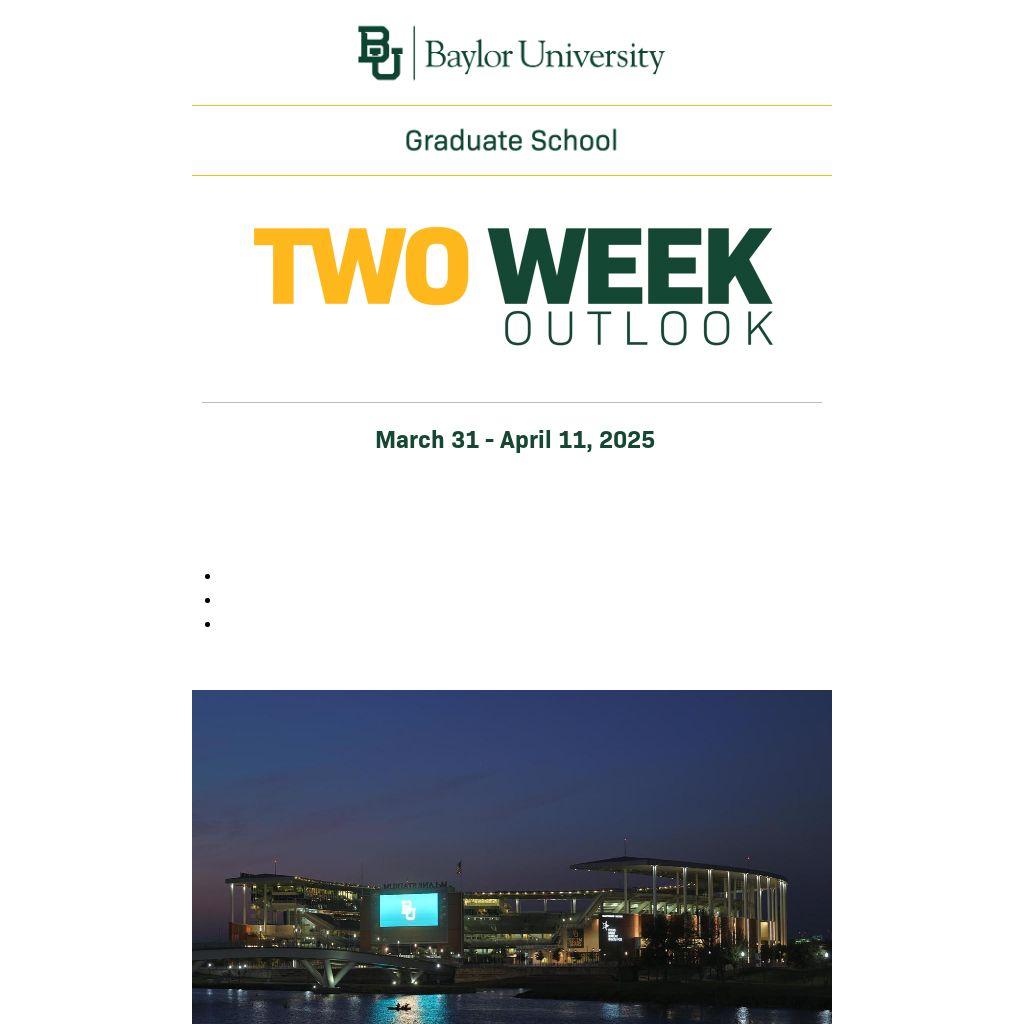 Happy Monday, graduate students! The Two Week Outlook is a weekly newsletter curated by graduate students for graduate students. Check it out every week so you don't miss: