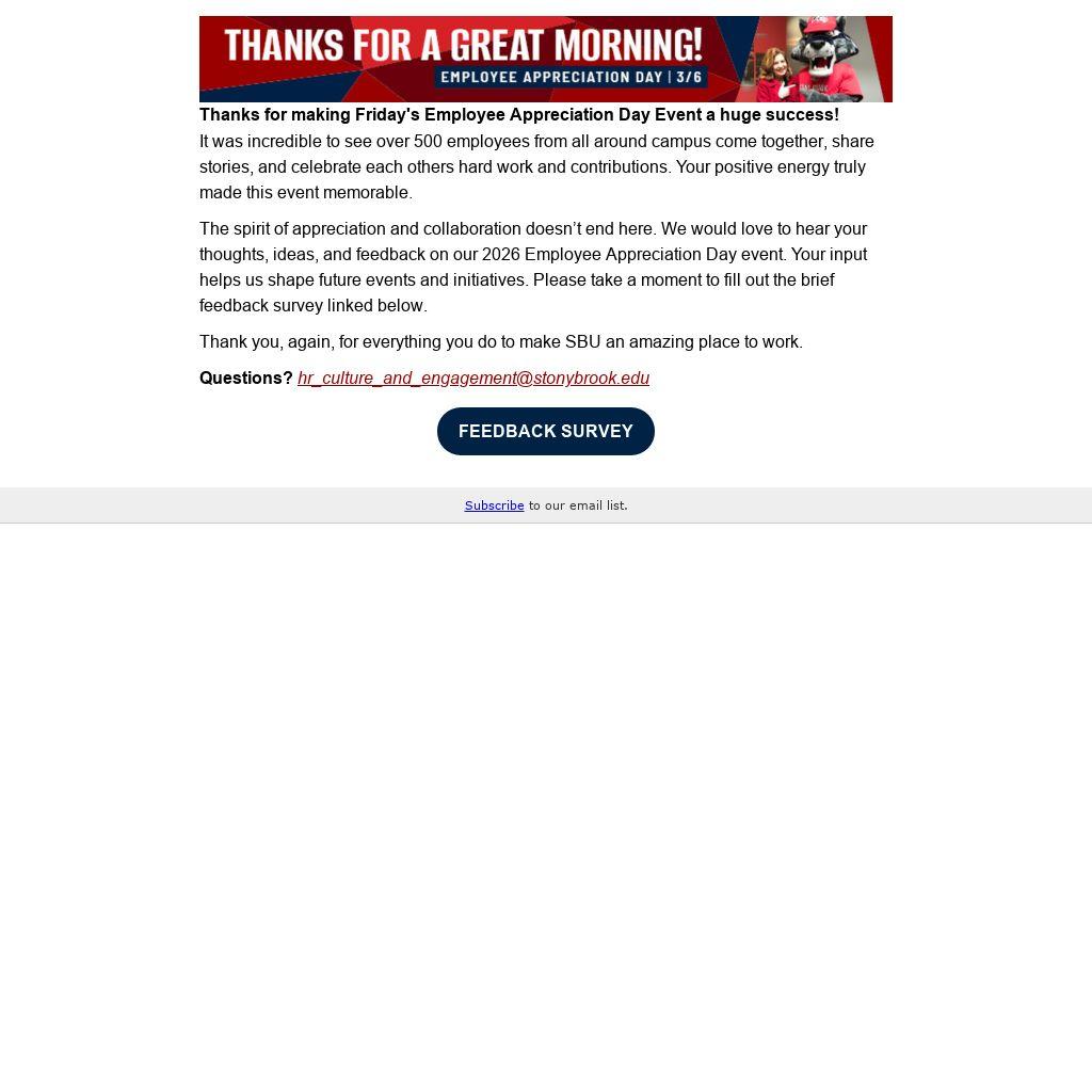 The spirit of appreciation and collaboration doesn’t end here. We would love to hear your thoughts, ideas, and feedback on our 2026 Employee Appreciation Day event. Your input helps us shape future events and initiatives. Please take a moment to fill out the brief feedback survey linked below.