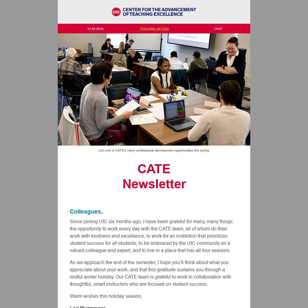 As we approach the end of the semester, I hope you’ll think about what you appreciate about your work, and that this gratitude sustains you through a restful winter holiday. Our CATE team is grateful to work in collaboration with thoughtful, smart instructors who are focused on student success.