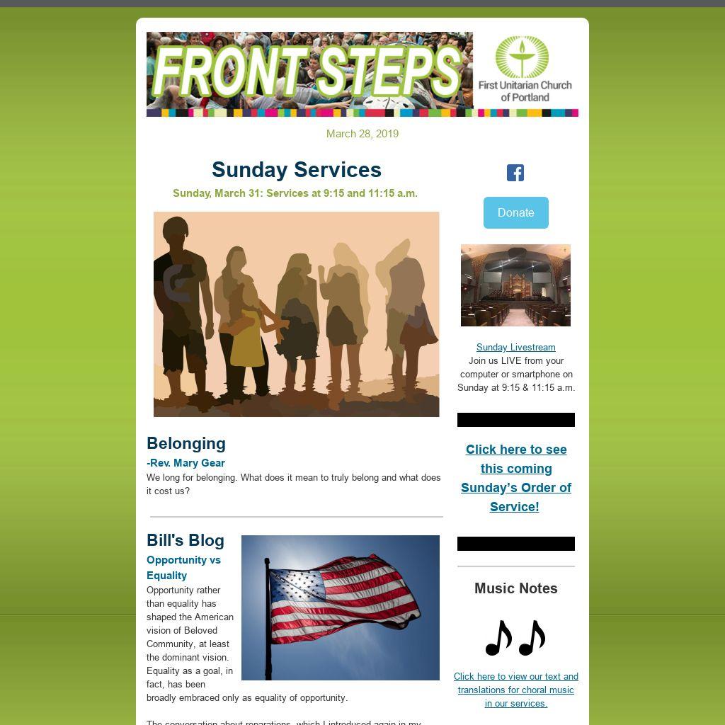 Do You Have an Item for E-news and/or the Sunday Bulletin?If you have an item you’d like published in our weekly Front Steps (eNews) or the Sunday Bulletin, please submit it to: