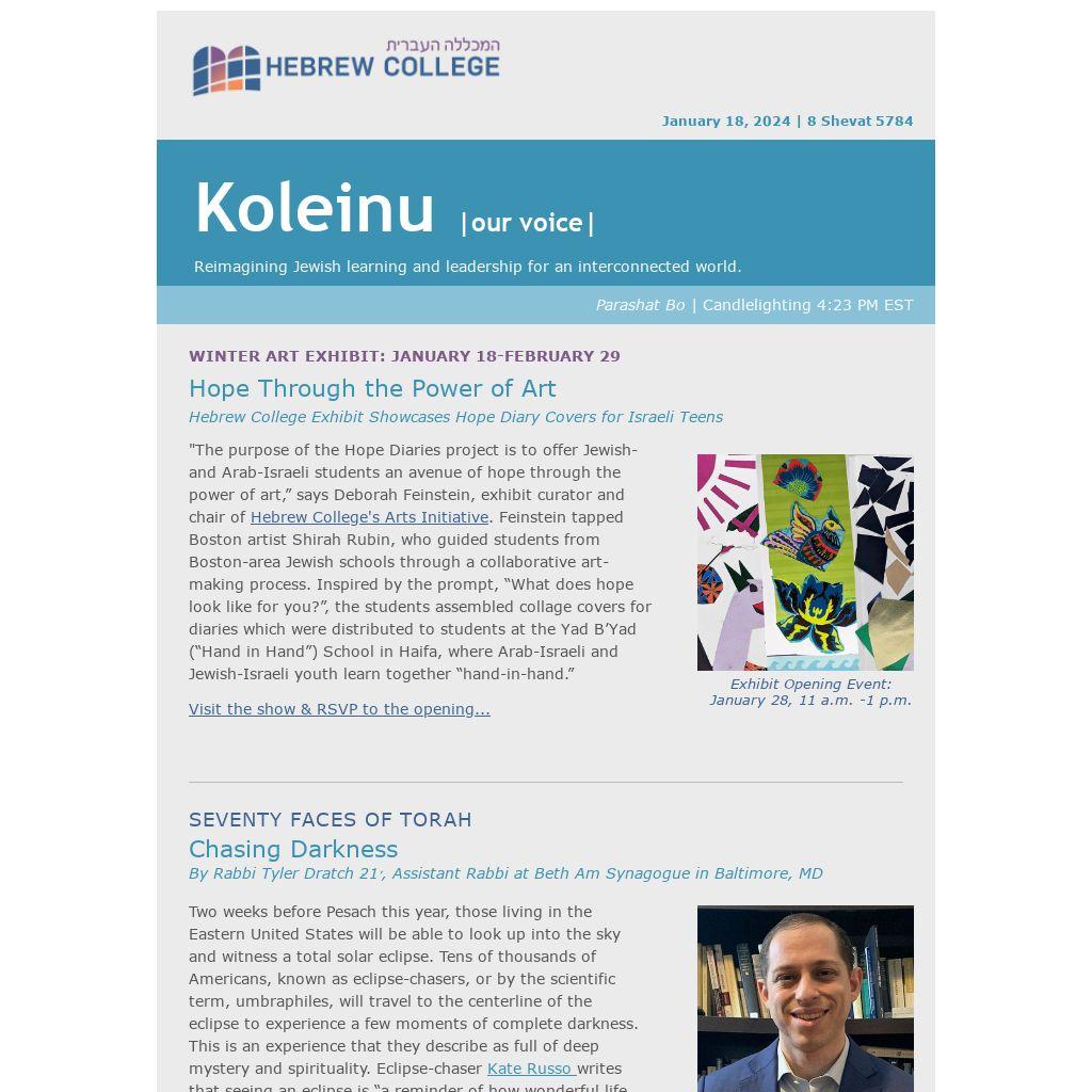 Led by local artist Shirah Rubin. Guided by the prompt, “What does hope look like for you?”, students from Boston-area schools created collage covers for unlined Hope Diaries, which were distributed to students at the Yad B’yad (Hand in Hand) School in Haifa, where Arab-Israeli and Jewish-Israeli youth learn together. Opening Event on January 28 | 11 a.m.-1 p.m. | Hebrew College Mascott Beit Midrash