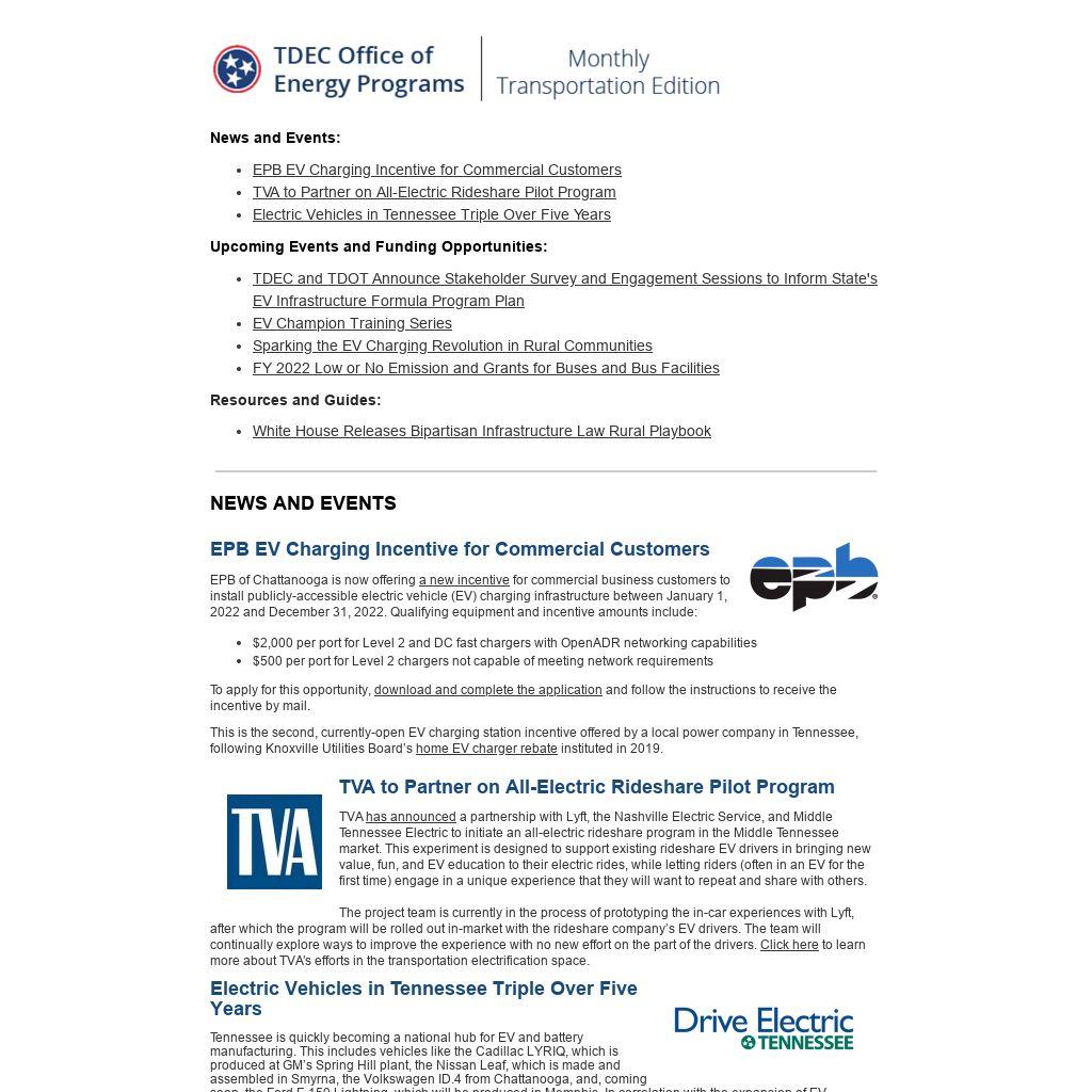 TDEC and TDOT have recorded a webinar to provide background on the NEVI Formula Program, the current state of transportation electrification in Tennessee, and key considerations to be included in the TEVI Deployment Plan. Click here to view the full webinar.