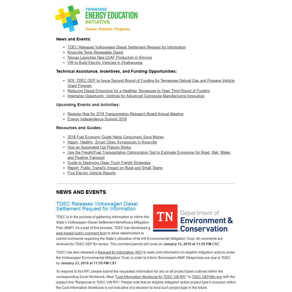 TDEC has also released a Request for Information (RFI) to seek cost information on eligible mitigation actions under the Volkswagen Environmental Mitigation Trust, in order to inform Tennessee's BMP. Responses are due to TDEC by January 23, 2018 at 11:59 PM CST.