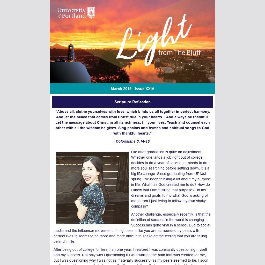 Life after graduation is quite an adjustment. Whether one lands a job right out of college, decides to do a year of service, or needs to do more soul searching before settling down, it is a big life change. Since graduating from UP last spring, I’ve been thinking a lot about my purpose in life. What has God created me to do? How do I know that I am fulfilling that purpose? Do my dreams and goals fit into what God is asking of me, or am I just trying to follow my own shaky compass?