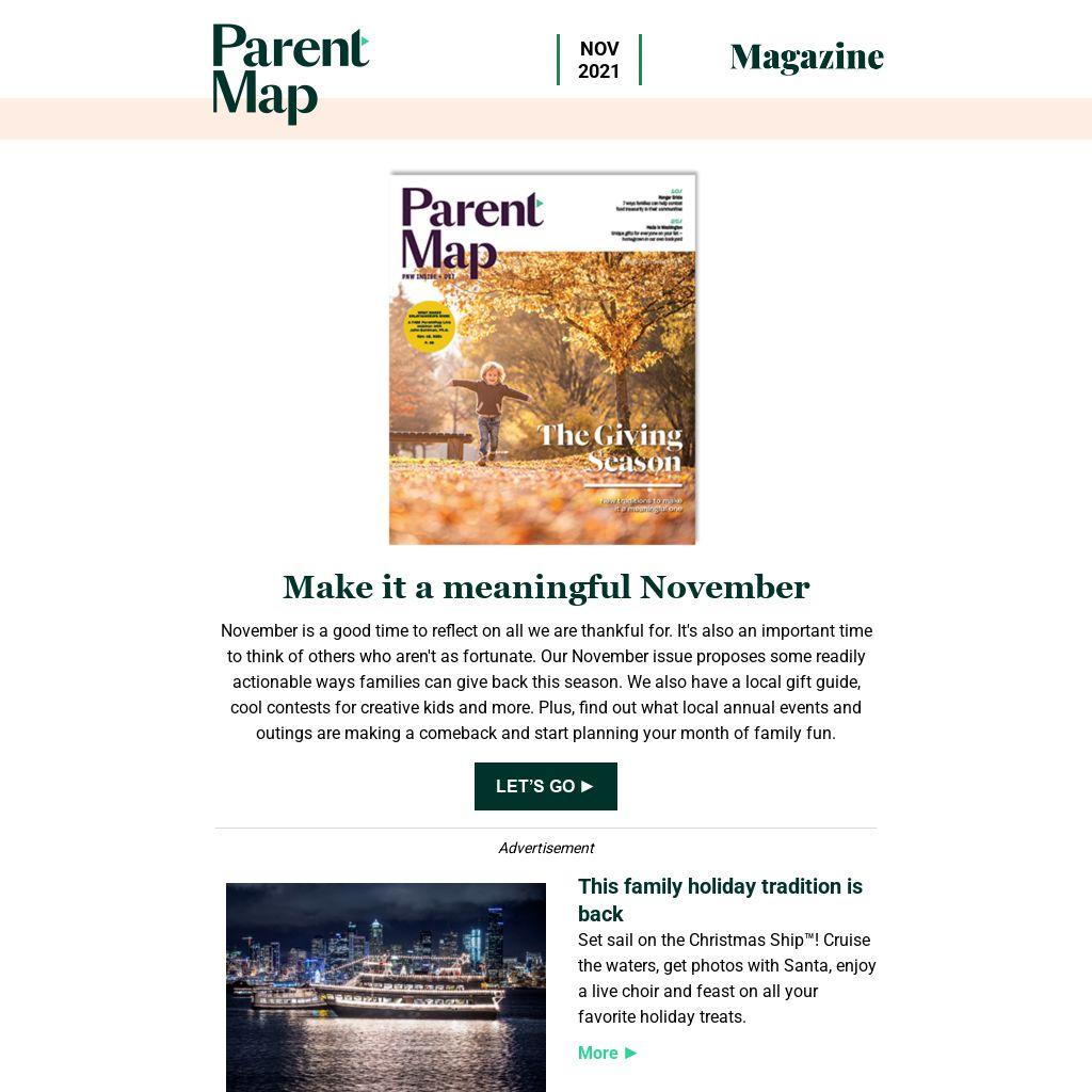 November is a good time to reflect on all we are thankful for. It's also an important time to think of others who aren't as fortunate. Our November issue proposes some readily actionable ways families can give back this season. We also have a local gift guide, cool contests for creative kids and more. Plus, find out what local annual events and outings are making a comeback and start planning your month of family fun.
