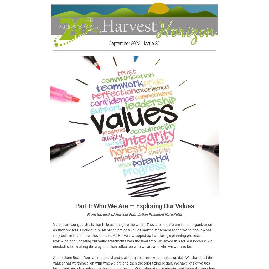 Values are our guardrails that help us navigate the world. They are no different for an organization as they are for us individually. An organization’s values make a statement to the world about what they believe in and how they behave. As Harvest wrapped up its strategic planning process, reviewing and updating our value statements was the final step. We saved this for last because we needed to learn along the way and then reflect on who we are and who we want to be.