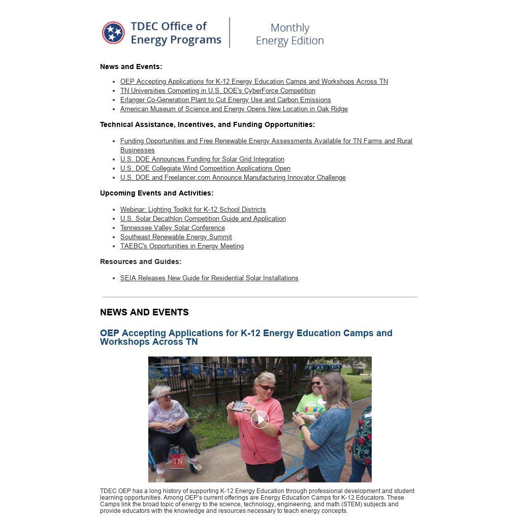| OEP Accepting Applications for K-12 Energy Education Camps and Workshops Across TN