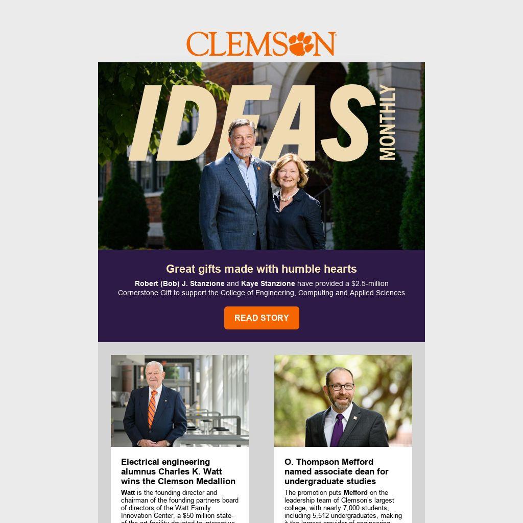 IDEAS Monthly is published by the PROMO Office in Clemson University’s College of Engineering, Computing and Applied Sciences. Contact the team with feedback or story suggestions.